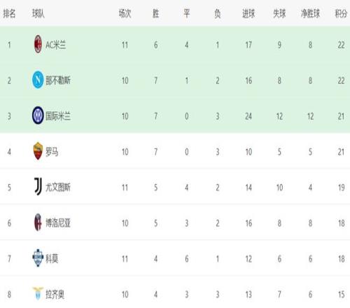 在积分榜上,AC米兰登上了榜首位置。AC米兰总积分达到22分,和那不勒斯积分相同,但在净胜球一样的情况下进球数占优,得以排名第1。不过,AC米兰比那不勒斯多赛一场,分分钟有可能被挤下去。国际米兰以21分排名第3。罗马也是21分,排名第4。尤文图斯19分,排名第5。博洛尼亚和科莫都是18分,排名第6和第7名。